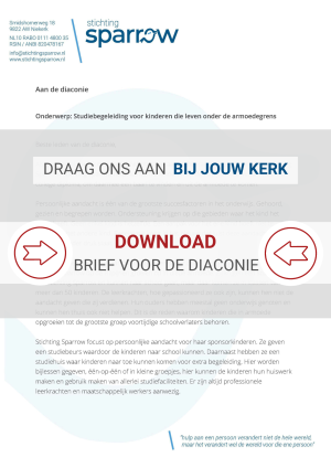 Kerken collecteren voor goede doelen. Een goed doel aangedragen door een eigen gemeentelid wordt vaker uitgekozen. Draag jij ons aan bij de diaconie van jouw kerk om een collecte of actie te organiseren voor stichting Sparrow?