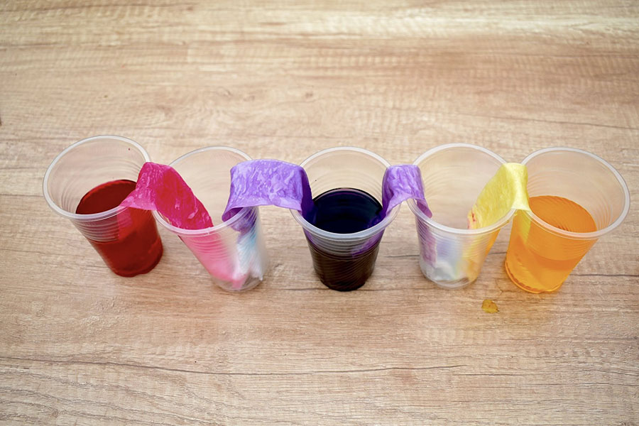 Het derde experiment was Walking Water. Met bekers, water, voedingskleurstof en tissues zagen de leerlingen hoe water zich kan verplaatsen en mengen. Dit vroeg wat geduld, maar zorgde voor veel verwondering.